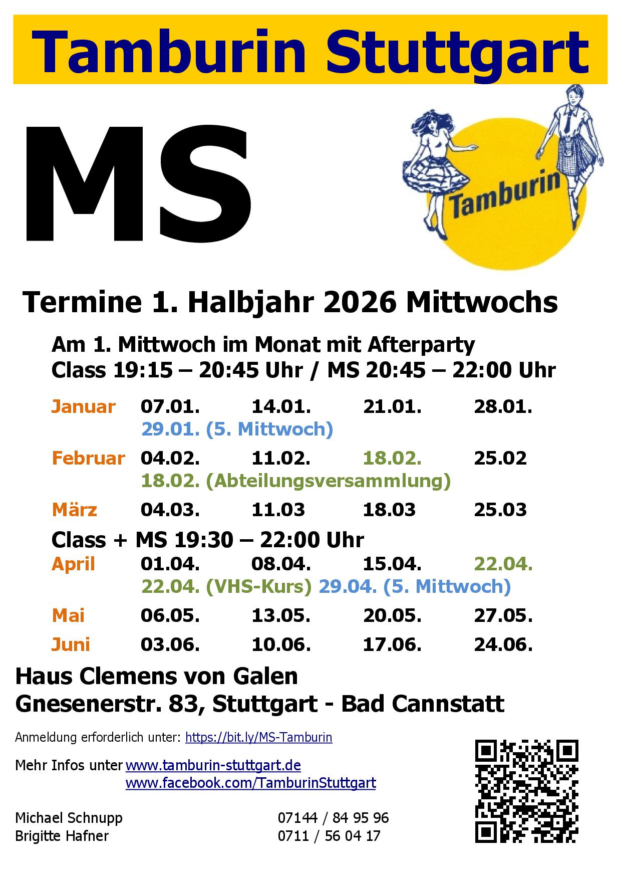 MS: mit Wolfgang Daiss (Wuffi) Termine 1.HJ 2026, (Download Termine 1.HJ 2026), Anmeldung (MS): Kulibri(Doodle) bitte ein Eintrag je Tänzer(in) Haus Clemens von Galen, Gnesener Str.83 - 85, Stuttgart - Bad Cannstatt |