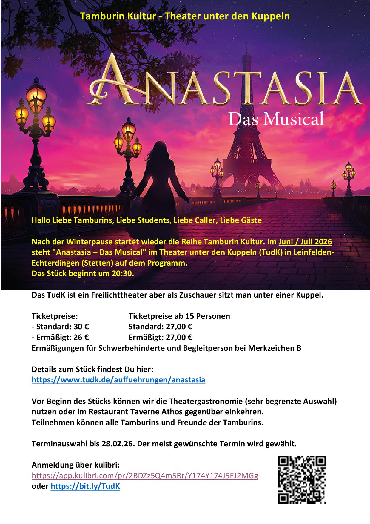 Tamburin Kultur - Theater unter den Kuppeln Anastasia ¿ Das Musical Nach der Winterpause startet wieder die Reihe Tamburin Kultur. Im Juni / Juli 2026 steht "Anastasia ¿ Das Musical" im Theater unter den Kuppeln (TudK) in Leinfelden-Echterdingen (Stetten) auf dem Programm. (Flyer) (Flyer zum Ausdrucken) Terminauswahl (Anastasia - Das Musical): Kulibri(Doodle) bitte ein Eintrag je Teilnehmer |